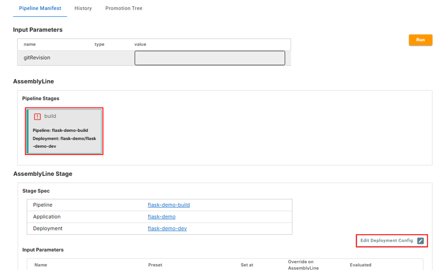 以下に今回利用したAssemblyLineの定義のうち、Results定義を抜粋したものを示しています。 AssemblyLineでAssemblyLine Resultsを設定することで、実行されたAssemblyLineからKey-Value形式で実行結果を出力でき、AssemblyLineのPromotion時に入力パラメータとして利用できるようになります。 今回は、imageNameというパラメータをbuild Stageから、gitRevisionをInput Parameterから出力するように設定しています。