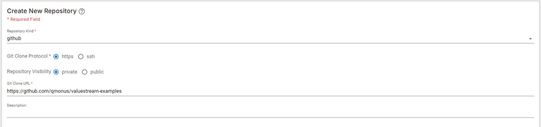 Repositoryの登録 アプリケーションを用意している GitRepositoryを登録します。 ここで設定した情報はQmonus Value Streamが実行中に読み出すリポジトリ情報として利用されます。