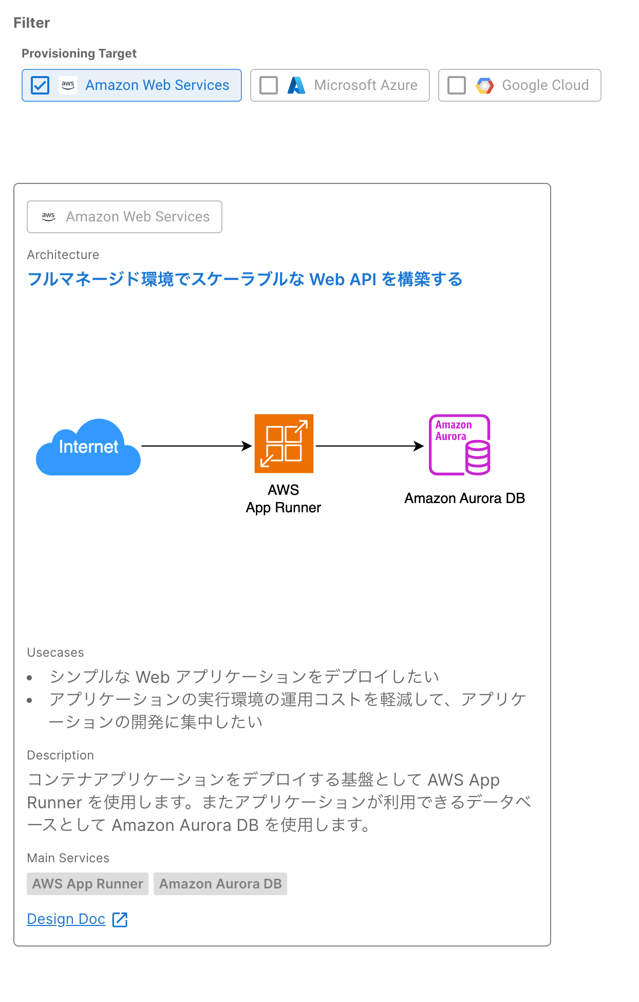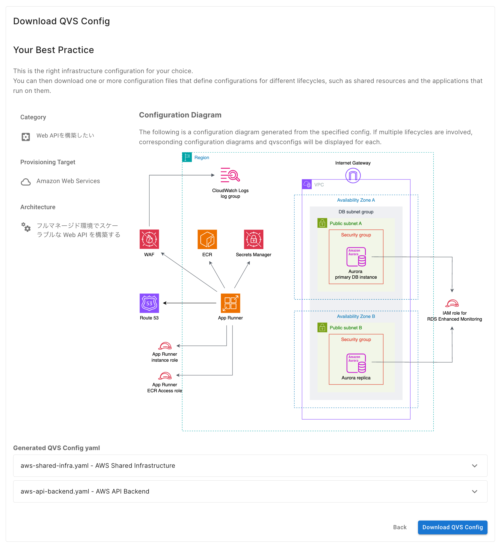 Architecture は Qmonus Value Stream がデプロイするインフラストラクチャ構成です。 選択したインフラストラクチャ構成に基づき QVS Config が自動的に生成されます。 生成された QVS Config を利用してデプロイすることで簡単に特定の構成のインフラストラクチャをデプロイできます。