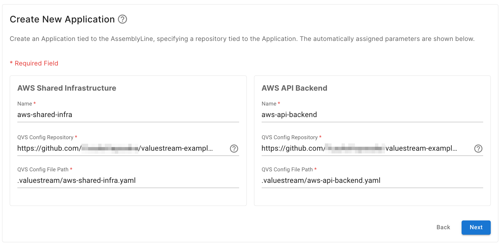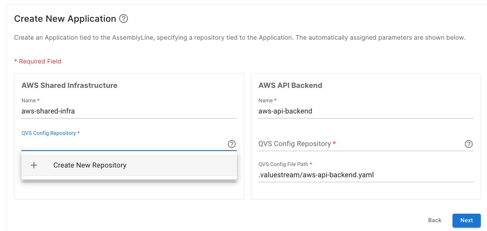 今回のチュートリアルでは AWS Shared Infrastructure と AWS API Backend Application の QVS Config は同一のリポジトリに格納されているため、画面において同一のリポジトリを参照していますが、リポジトリを別に分ける場合はそれぞれのリポジトリを登録し、指定してください。