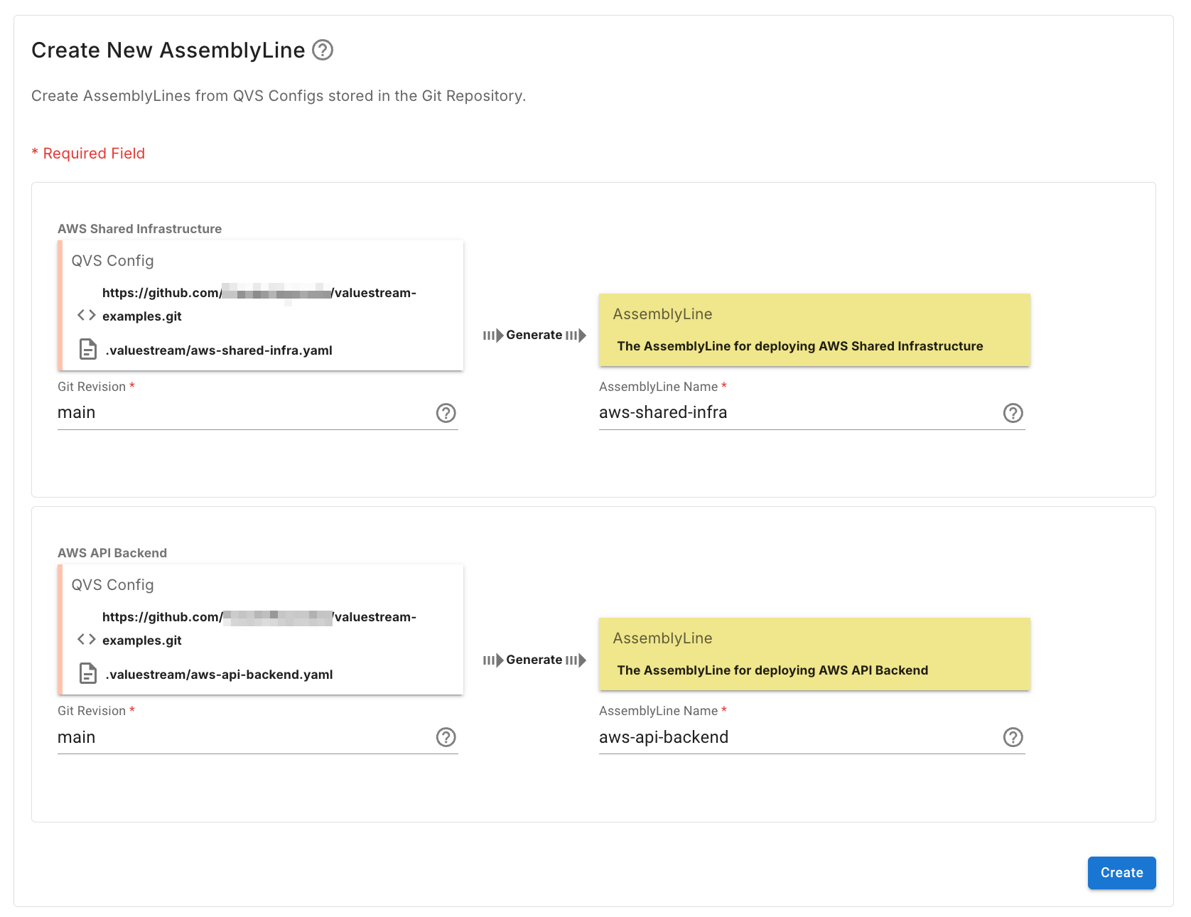 今回は手順3で、aws-shared-infra と aws-api-backend の二つの Application と、それぞれに紐づく Deployment を登録しました。 さらに、手順4-1で、それぞれの Application に紐づくリポジトリから QVS Config を読み込み、Task, Pipeline,AssemblyLine を登録しました。