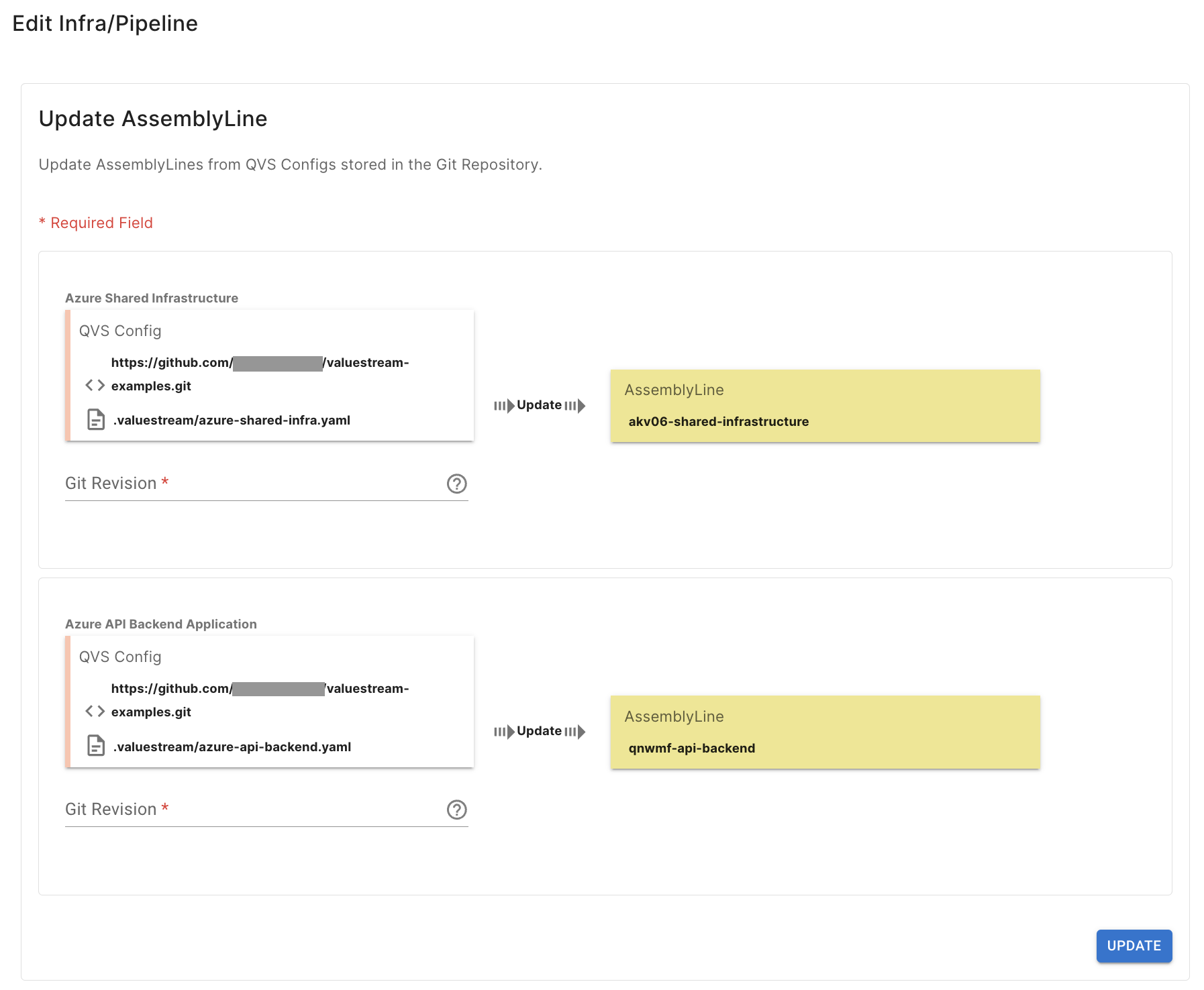 本チュートリアルでは、Option を追加選択したことで azure-shared-infra の QVS Config と azure-api-backend の QVS Config が両方とも更新されています。 このため、UPDATE ボタンを押下すると、azure-shared-infra の CI/CD パイプラインと azure-api-backend の CI/CD パイプラインが両方とも更新されます。