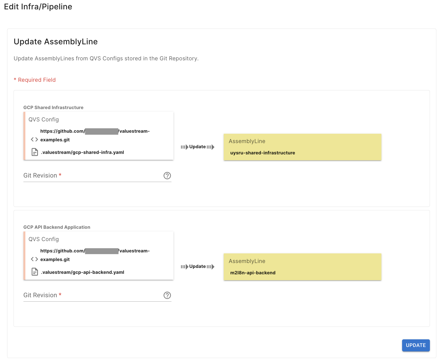 本チュートリアルでは、Option を追加したことで更新された QVS Config は gcp-api-backend の QVS Config のみであり、gcp-shared-infra の QVS Config については 手順2-1で作成した内容からの変更差分はありません。 このため、UPDATE ボタンを押下すると、gcp-api-backend の CI/CD パイプラインのみが更新されます。