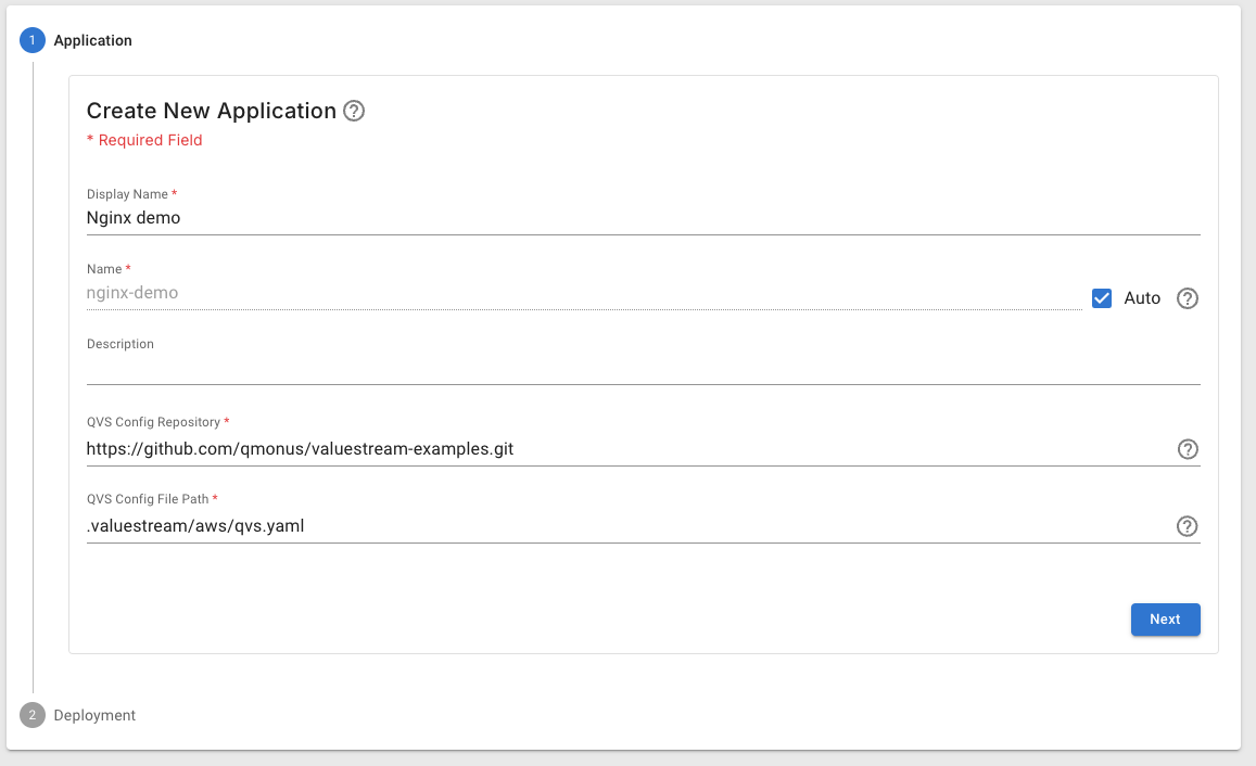 Repositoryはデプロイ対象のアプリケーションが格納されたGitの情報です。 RepositoryはApplicationに内包する形で登録します。 今回はApplicationとしてサンプルアプリケーションをデプロイしたいので、サンプルアプリケーションが存在しているGitリポジトリ https://github.com/qmonus/valuestream-examples を指定します。