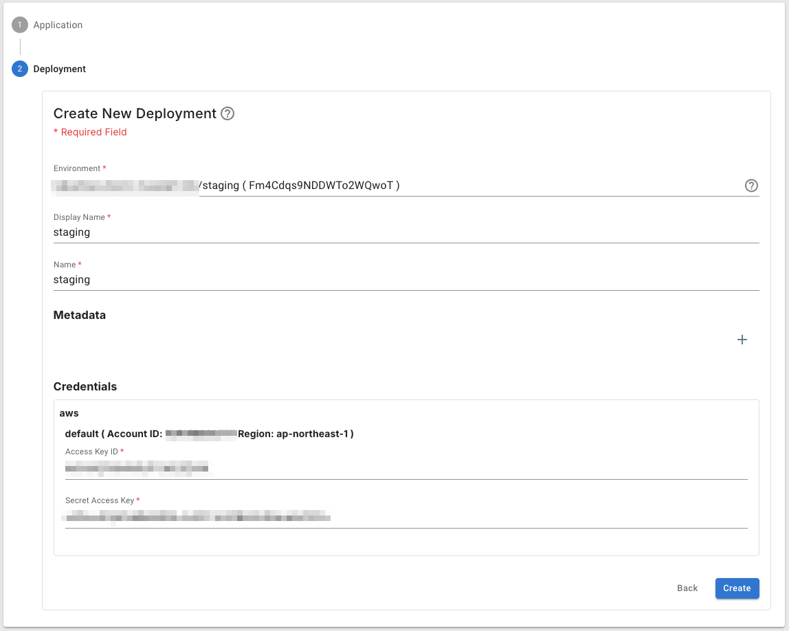 ここでは、手順1-1で登録したApplicationをデプロイするためのEnvironment及びDeploymentを作成します。 さらに、App Runner サービスを作成するのに必要な認証情報を、Environmentに登録します。