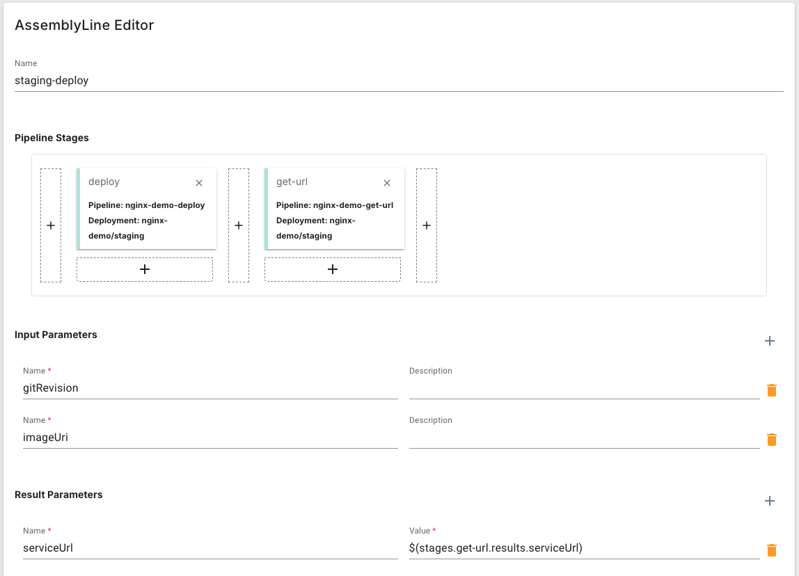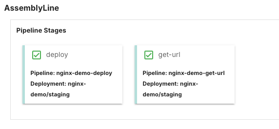 登録するPipelineは、App Runner サービスを作成して Nginx をデプロイするdeployという名称のPipelineと、作成された App Runner サービスの URL を取得するget-urlという名称のPipelineです。 この2つのPipelineを登録できたら、登録した2つのPipelineを利用したAssemblyLineを登録します。