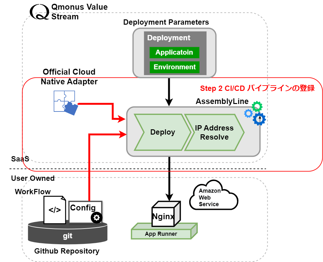 └──Step今回は以下の図に示すように、サンプルアプリケーションをデプロイするための2つのPipelineと、それらのPipelineをまとめたAssemblyLineを登録します。