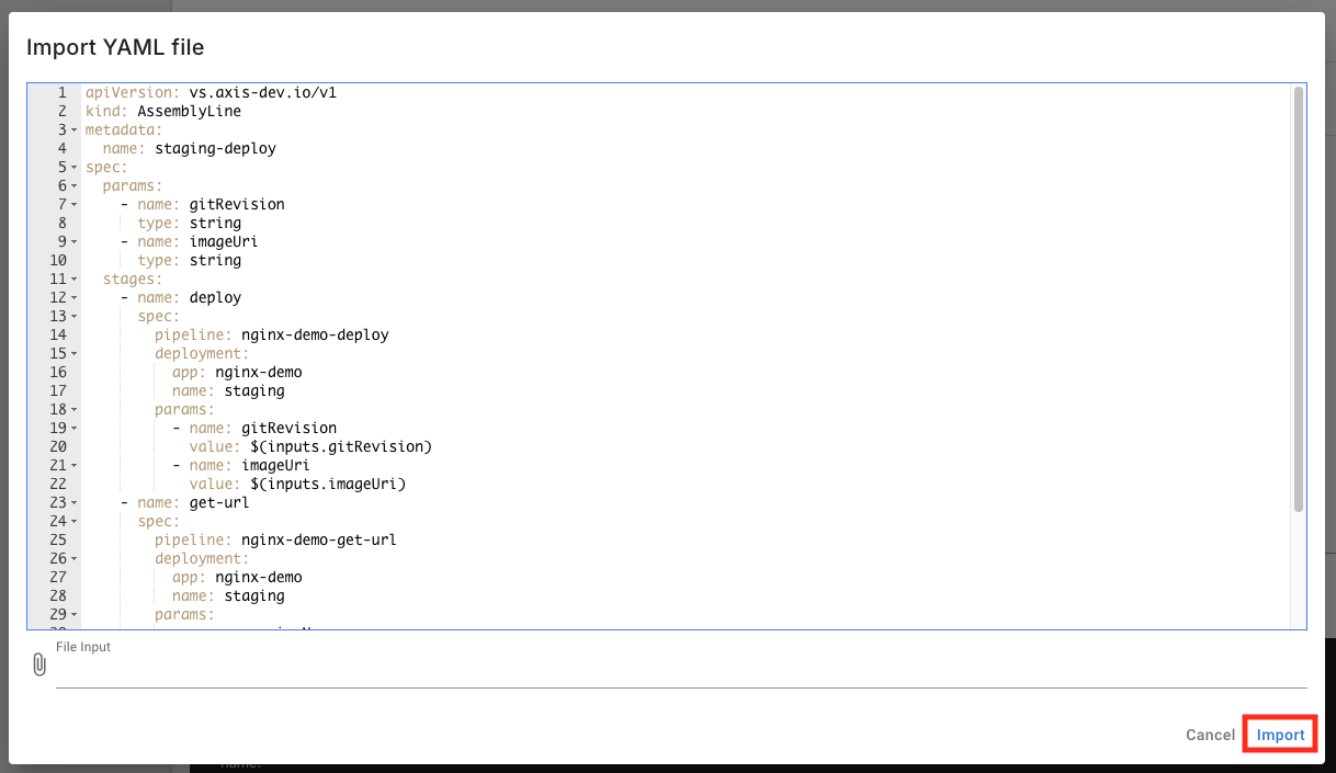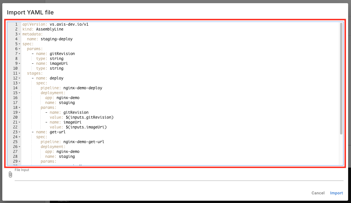 インポート画面に移動したら、サンプルアプリケーションのリポジトリに含まれる .valuestream/aws/assemblyline-staging.yaml の内容を全てコピーして、YAMLエディタに貼り付けます。