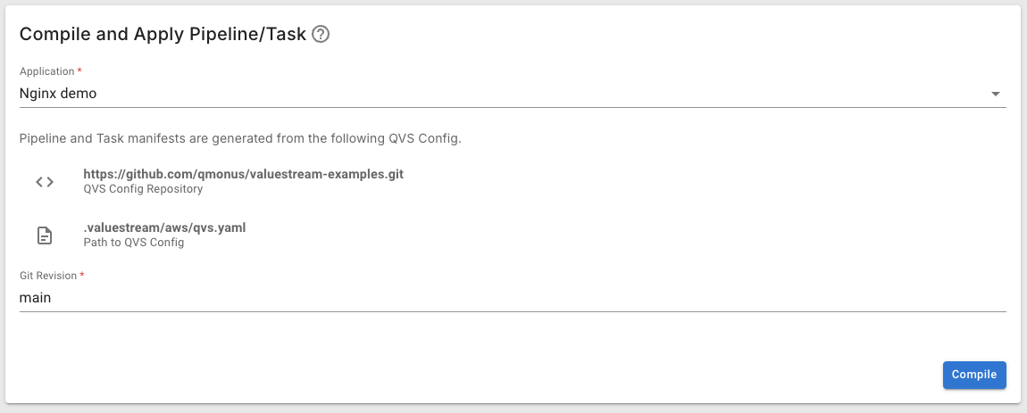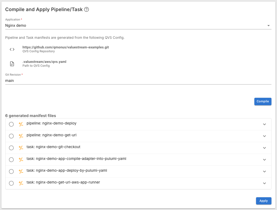 最初にAssemblyLineを登録するためのPipelineとTaskを登録します。 PipelineとTaskを登録するにはサンプルアプリケーションのリポジトリに含まれるqvs.yamlをコンパイルする必要があります。 Qmonus Value Streamは、qvs.yaml に書かれたPipelineの定義を読み取り、PipelineとTaskを生成します。